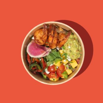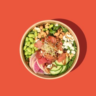 sushi rice, arugula, cucumber, edamame, watermelon, watermelon radish, feta, mint, fried shallots, smoked cashews, alfalfa sprouts, kosho vinaigrette